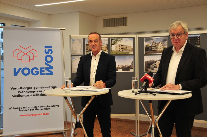 Die VOGEWOSI setzt ihre Wohnbauoffensive erfolgreich fort. In den Jahren 2024 und 2025 lag die Bautätigkeit der größten gemeinnützigen Wohnbau-Vereinigung Vorarlbergs auf Rekordniveau. Insgesamt wurden in diesen beiden Jahren knapp 300 neue Wohnungen fertiggestellt, das Volumen für Neubauten wurde allein im Jahr 2024 um mehr als 70 Prozent auf über 50 Mio. Euro gesteigert, auch 2025 wird dieses hohe Niveau gehalten. „Ein Neubauvolumen von 87 Millionen Euro in zwei Jahren ist ein neuer Höchststand, der zeigt, dass wir trotz schwierige Marktbedingungen ein starkes Zeichen für leistbares Wohnen setzen und für die Zukunft gut aufgestellt sind“, betonen Geschäftsführer Hans-Peter Lorenz und Aufsichtsratsvorsitzender Karlheinz Rüdisser beim Pressegespräch am 19.12.2025 in Dornbirn.